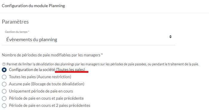 Suite à la livraison de la fonctionnalité de blocage de dévalidations de planning par les managers sur les périodes de paies passées, il subsistait un besoin de rappeler la configuration de la société au niveau du paramètre de chaque site. En effet, les Partenaires n’ont pas encore accès à la configuration de la société.