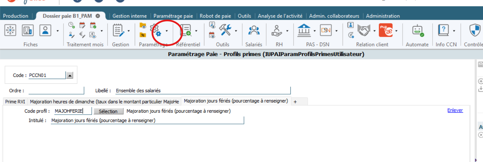 Dans Paramétrage > Primes > Profil utilisateur, sélectionner le code PCCN01 puis faire ajouter un profil, sélectionner le code profil MAJOHFERIE