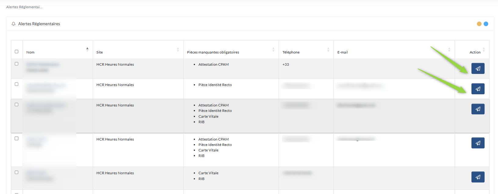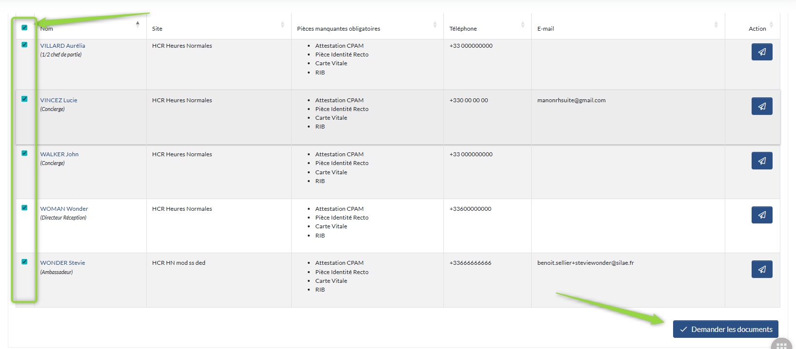 Vous disposez ensuite d’un tableau qui vous permet de visualiser, pour chaque collaborateur, les pièces manquantes. Depuis ce tableau, vous pouvez relancer un collaborateur par e-mail via le bouton Action, ou effectuer une relance en masse pour plusieurs collaborateurs simultanément.